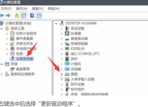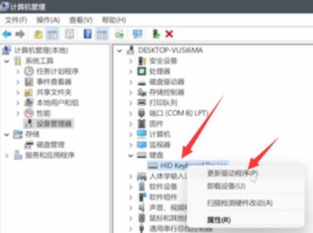 3、展开“键盘”选项,在下方找到其中我们的键盘设备,右键选中后选择“更新驱动程序”。