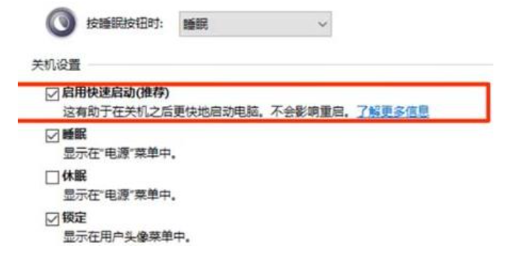 4、最后将“关机设置”中的“启动快速启动【推荐】”前面的√取消即可。