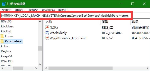 2、如果使用的是USB接口的键盘,在注册表编辑器中定位到以下路径“计算机\HKEY_LOCAL_MACHINE\SYSTEM\CurrentControlSet\Services\kbdhid\Parameters”,如果使用的是圆头的PS/2键盘,定位到以下路径“计算机\HKEY_LOCAL_MACHINE\SYSTEM\CurrentControlSet\Services\i8042prt\Parameters”: