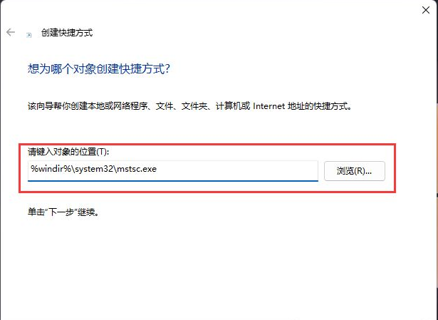2、创建快捷方式窗口,请键入对象的位置,输入【%windir%\system32\mstsc.exe】,然后点击【下一页】;