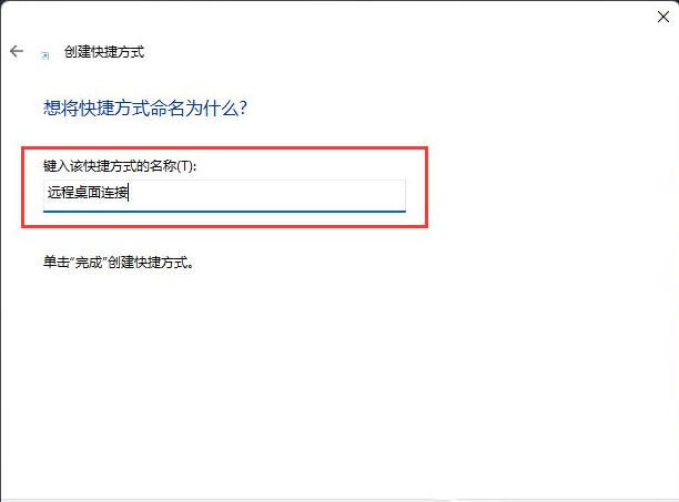 3、键入该快捷方式的名称,输入【远程桌面连接】,然后点击【完成】创建快捷方式;