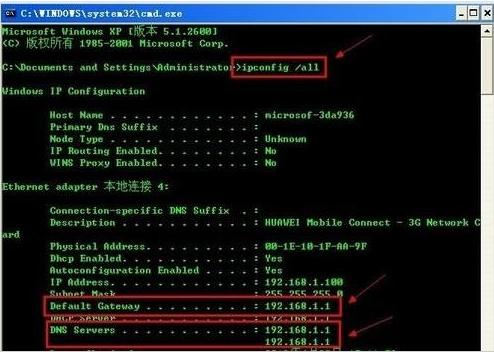2、在MSDOS界面中输入命令“ipconfig /all”,在显示结果界面中可以查看到本地网关以及DNS信息,并且把IP地址和DNS服务器数字记录下来。