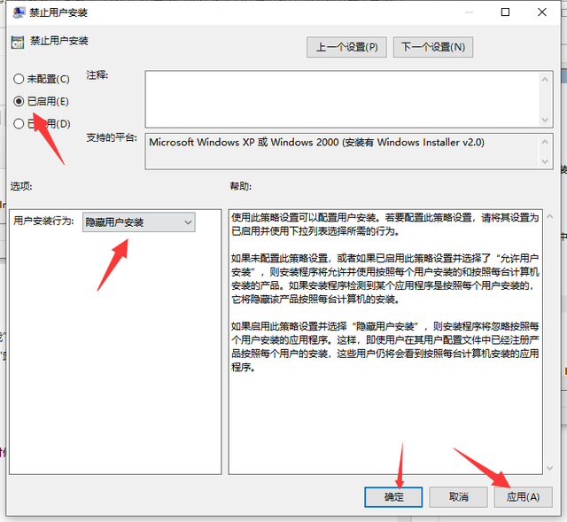 3、选择启用并“隐藏用户安装”,电脑就不会自动下载乱七八糟的软件了。