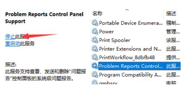 2、找到“problem reports control”服务,点击蓝色字体“停止”。