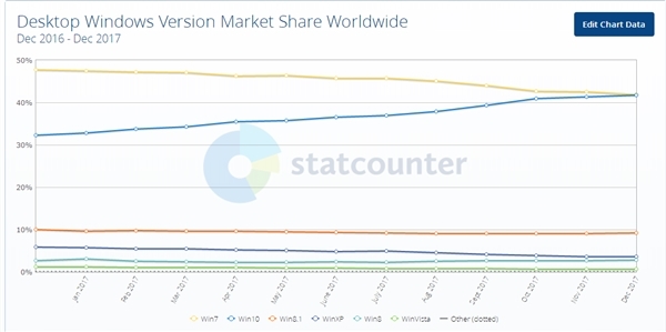 微软之所以延期,有观点认为,从统计机构的数据来看,可能因为观察到了在12月,Win7/8.1的淘汰率上扬,Win10转入率爬升所致。