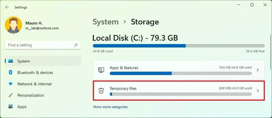 要删除临时文件以释放 Windows 11 上的空间,请使用以下步骤: