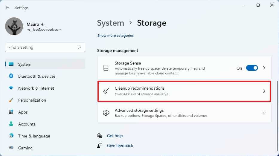 要使用清理建议来释放 Windows 11 上的空间,请使用以下步骤:
