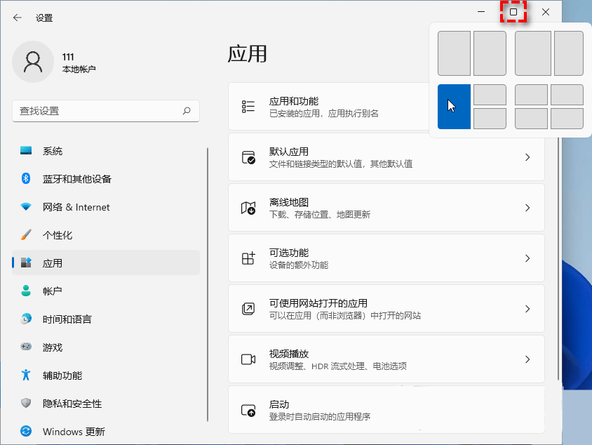 它可以快速将桌面上打开的应用程序排列成一个布局,并纳入到同一个分组。将鼠标指针悬停在任意窗口的“最大/小化”图标上,很快会弹出一个小窗口,显示不同布局的类型,并会突出显示您希望当前窗口去到的位置。