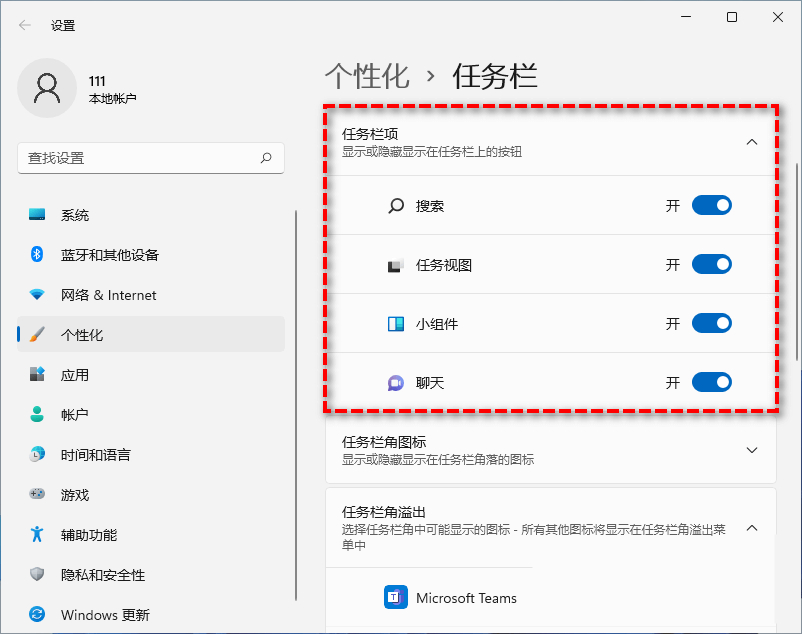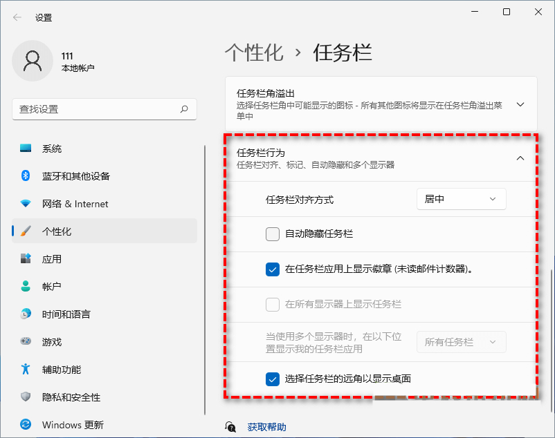 1、找到任务栏行为,将任务栏对其方式修改为“左”即可将这个win11功能关闭。