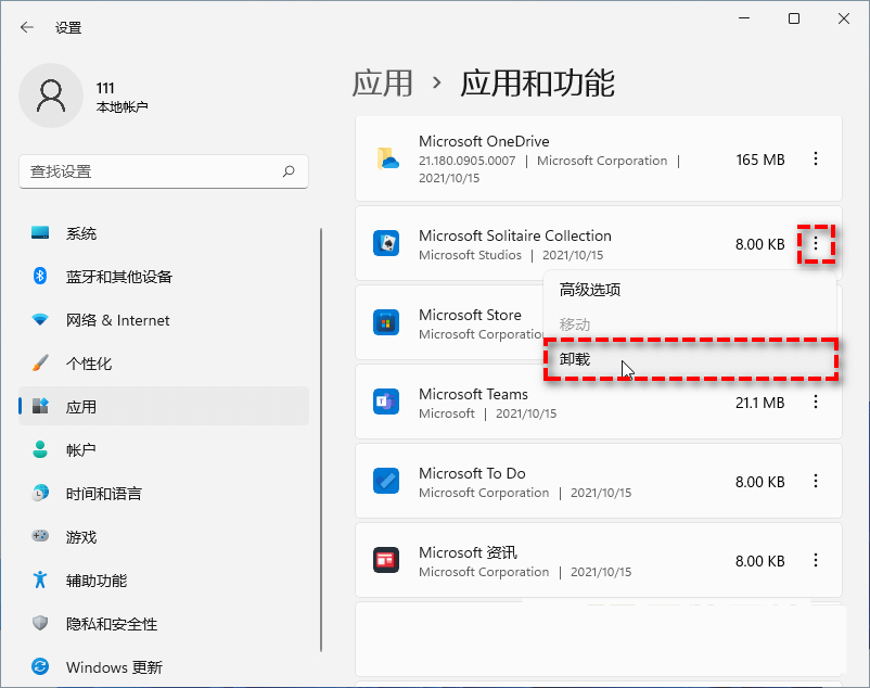 按Win+I打开“设置”>“应用”>“应用和功能”,这里会列出电脑中安装的应用程序,其中包括系统自带。找到要卸载的应用,点击右侧的三个点,卸载即可。