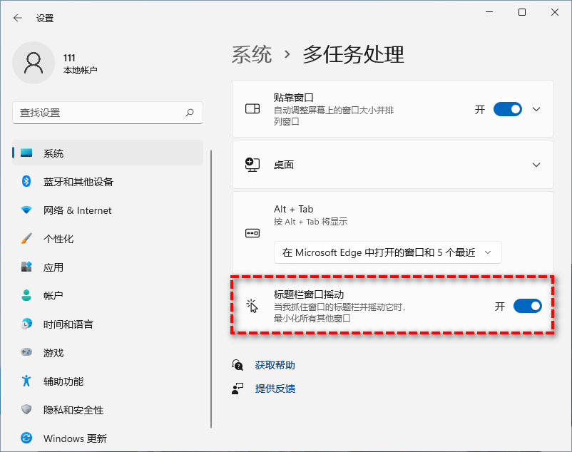 虽然win11中也有这个功能,但是有些小伙伴拖住窗口使劲摇晃后发现并没有什么卵用,这是因为在win11中默认禁用了该功能,如果需要的话可以按Win+I打开“设置”>“系统”>“多任务处理”,将“标题栏窗口摇动”打开即可。