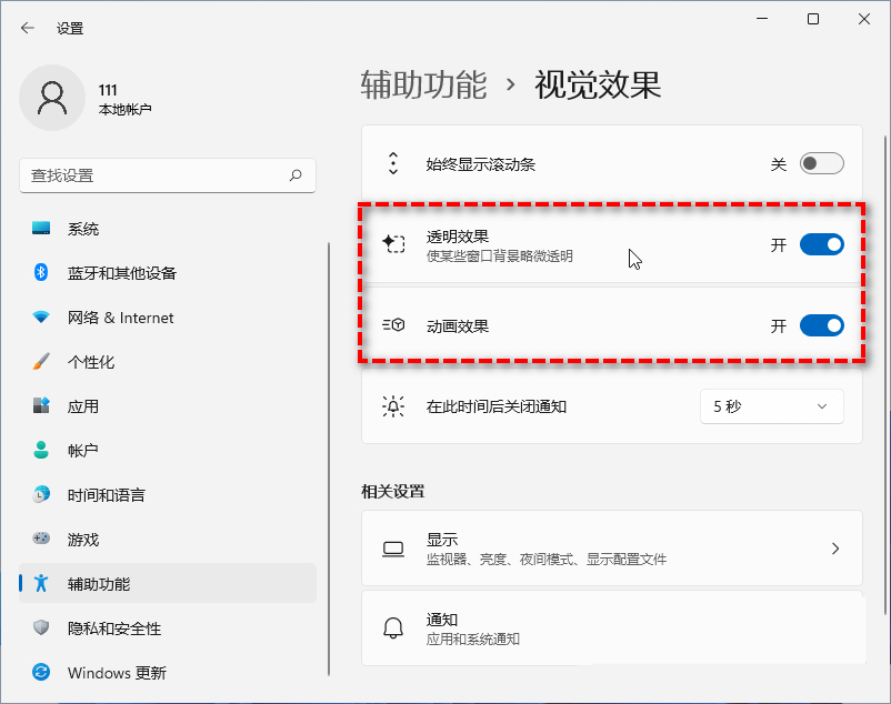 您可以按Win+I打开“设置”>“辅助功能”>“视觉效果”,将透明效果和动画效果都关闭。