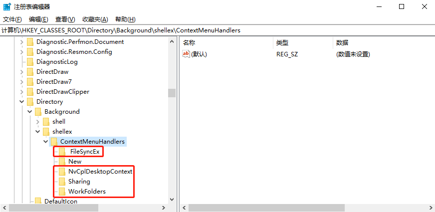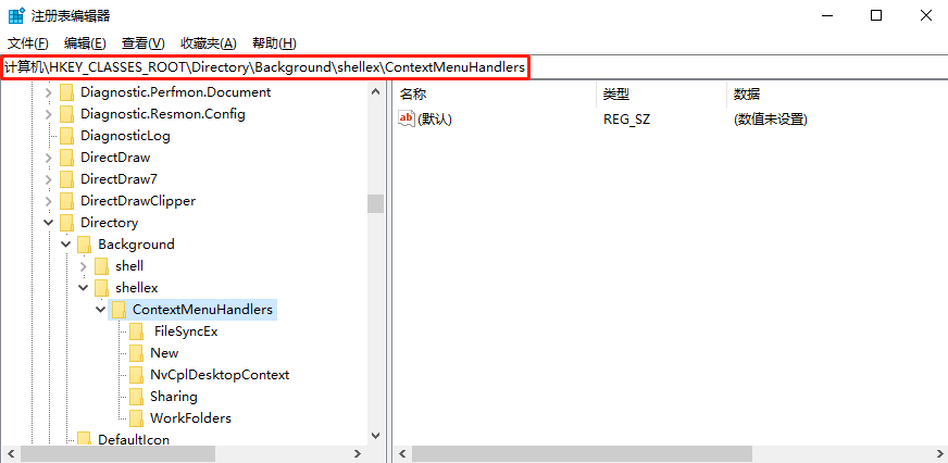 3、然后,在注册表中定位到“HKEY_CLASSES_ROOT\Directory\Background\shellex\ContextMenuHandlers”。