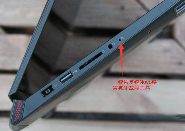 1、插入U盘启动盘,在关机状态下,在笔记本两侧,找到novo一键恢复键,使用牙签等小工具,扎一下。