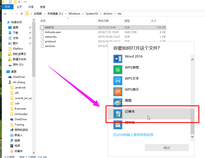 右键点击hosts文件,选择打开方式,使用系统自带的记事本打开
