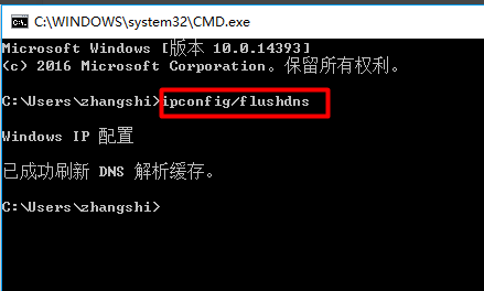 在弹出界面中输入ipconfig/flushdns,回车