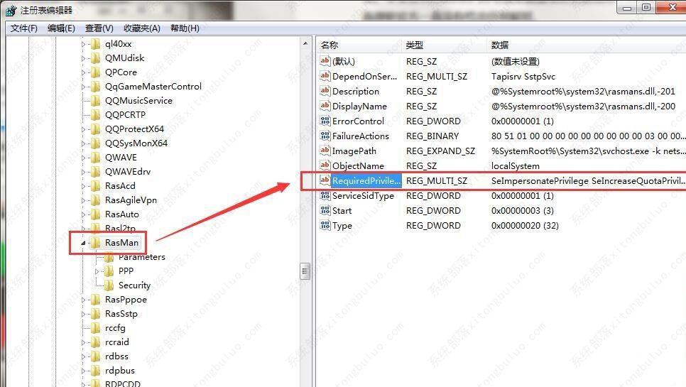 2、接着,在打开的注册表界面中,依次点击“HKEY_LOCAL_MACHINE\SYSTEM\CurrentControlSet\Services\RasMan”,如图所示;
