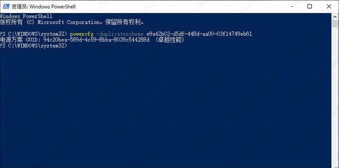 接下来输入代码“powercfg -duplicatescheme e9a42b02-d5df-448d-aa00-03f14749eb61”(不含引号,建议直接复制!!!),如果一切无误,屏幕上将显示出“电源方案 GUID: 94c20bea-589d-4c59-8bba-8039c544288d (卓越性能)”字样,这时我们便成功开启了“超级性能模式”(中文版翻译成“卓越性能”模式,甭管它了,哪个顺眼就叫哪个吧~)