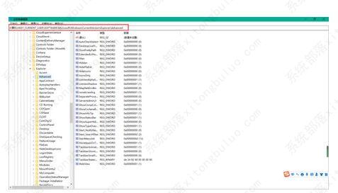 3、接着系统就会弹出注册表文件编辑器的窗口了,在此界面的左侧,大伙儿进入【HKEY_CURRENT_USER\SOFTWARE\Microsoft\Windows\CurrentVersion\Explorer\Advanced】方式中来。