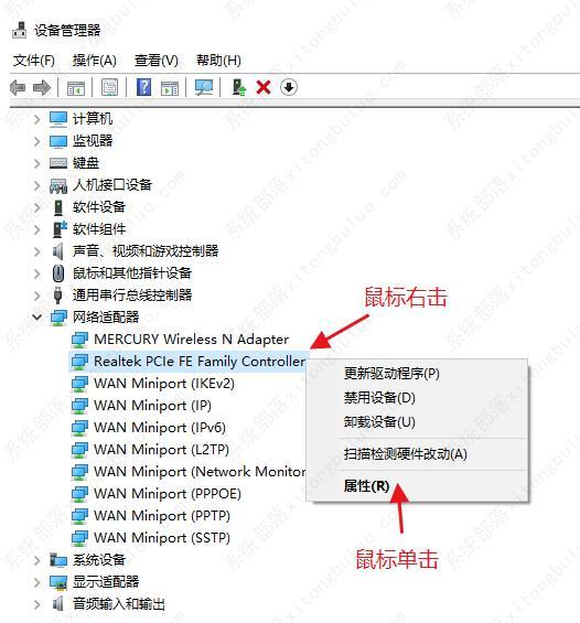 3、在“设备管理器”中找到“网络适配器”网卡驱动项(如“Realtek PCle FE… ”,“Realtek PCle GbE… ”,“intel(R)HD graphics …”,“intel(R) Ethernet …”等,不同显卡不一样),鼠标右击“属性”,如图:
