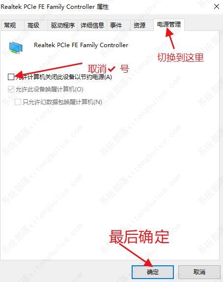 4、切换到“电源管理”,找到“允许关闭计算机此设备以节约电源”前面对勾取消掉,然后确定即可,如图: