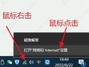 1、在系统工具栏,找到“网络”图标,鼠标右击在弹出的菜单中点击“打开网络和Internet设置”项,如图所示: