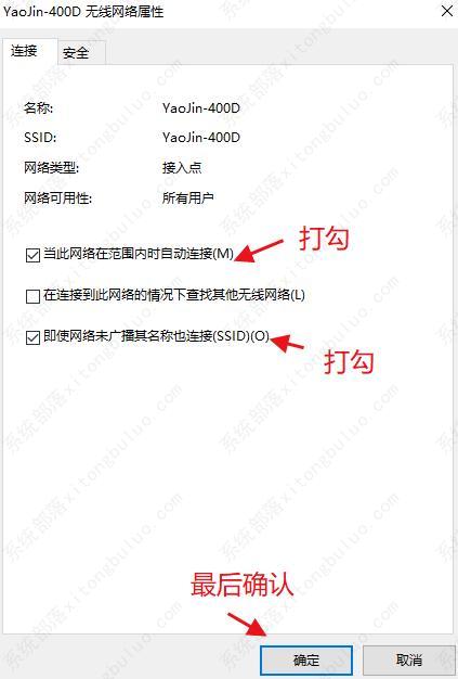 5、“当此网络在范围内时自动连接”,“即使网络未广播其名称也连接”,两项前面打勾✔,如图: