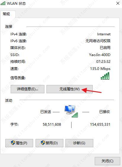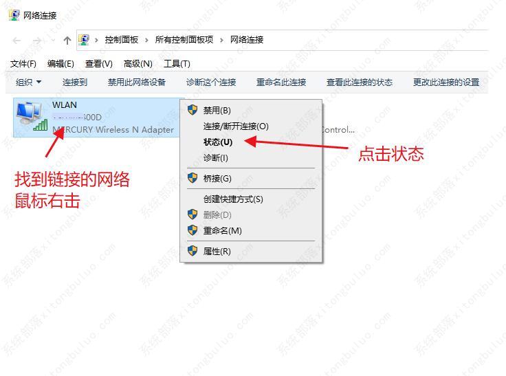 3、找到已经链接的网络,鼠标右击,在弹出的菜单中找到“状态”鼠标点击进入,如图: