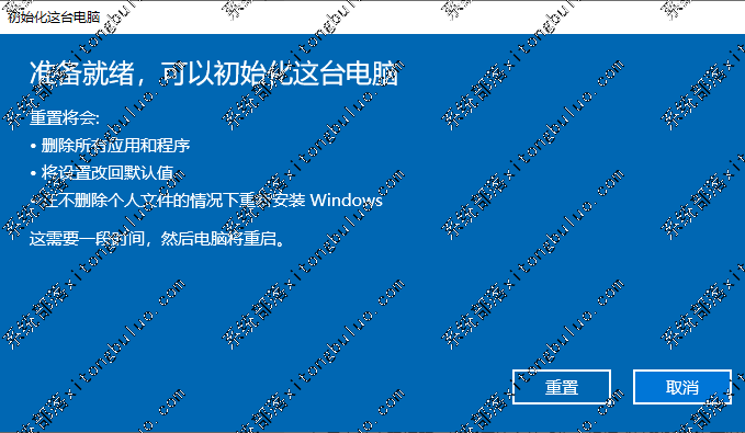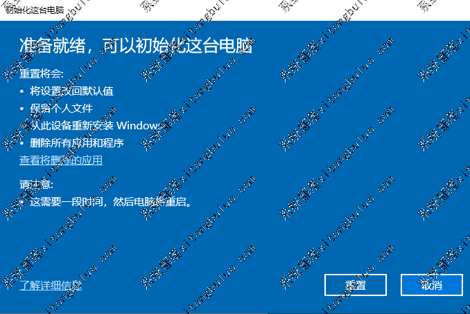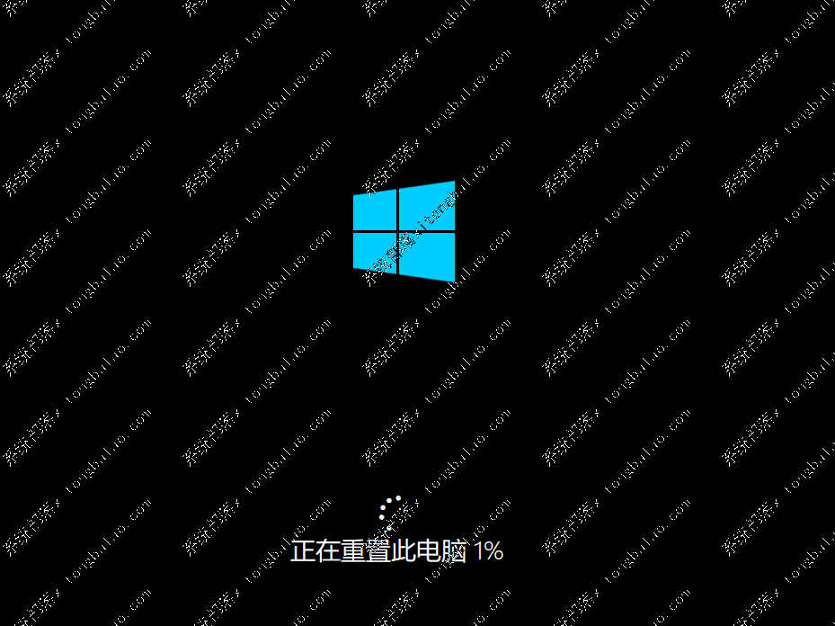 8、点击重置后,保持电源连接,等待半个小时(实际时间和电脑性能有关系)左右,就重置完成了,请耐心等待,在下面这两个界面时,请不要强制关机,否则你的电脑可能会无法启动,只能重装系统了。