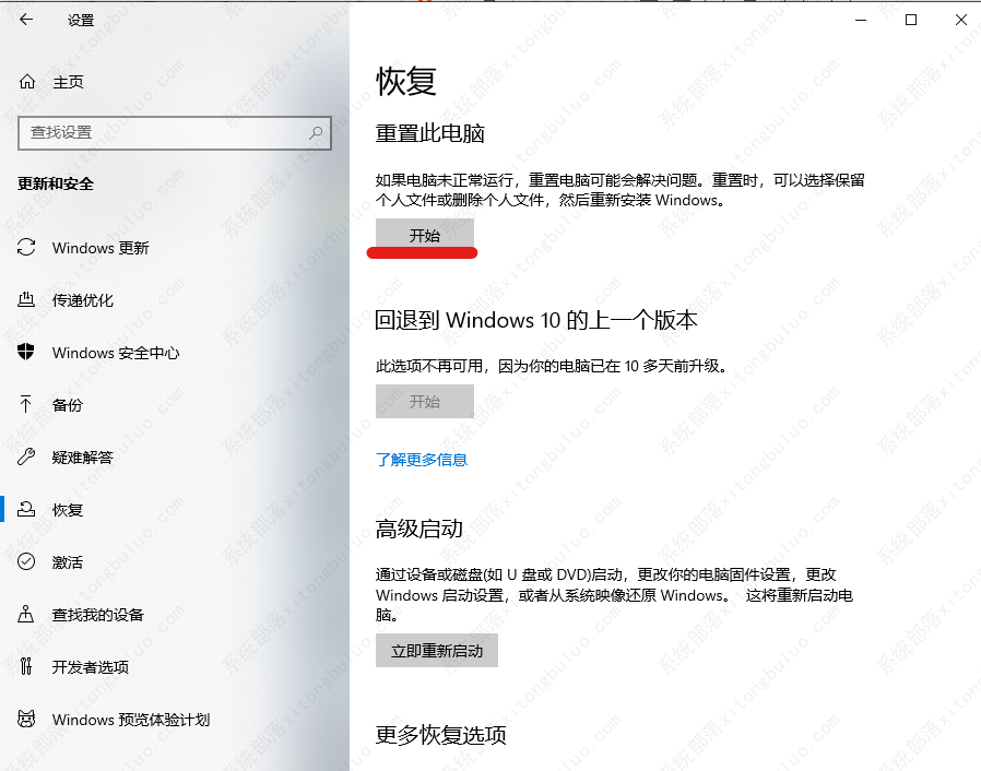 1、点击开始菜单→设置→更新和安全→恢复,然后点重置此电脑下面的开始。