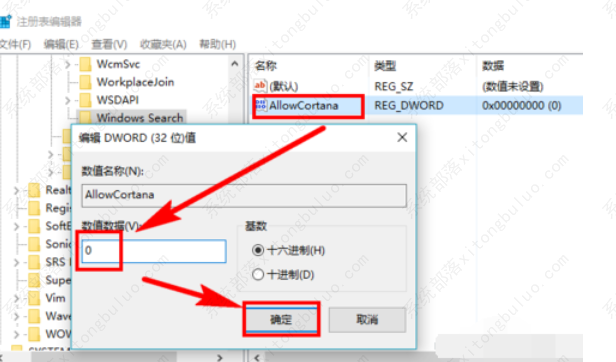 4、双击新建的值【AllowCortana】,查看【数值数据】的值是不是0,如果不是,修改为“0”,点击【确定】,这样小娜Cortana就被禁用了。