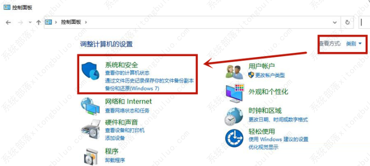 3、然后在控制面板把查看方式调整为类别,再进入系统和安全内。