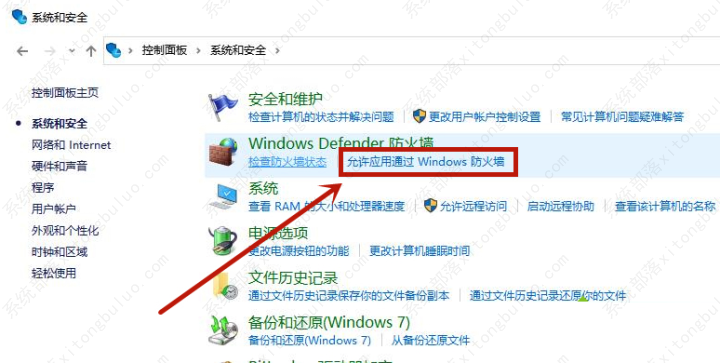 4、然后我们要在系统防火墙内进行相应设置,点击允许应用通过Windows防火墙。