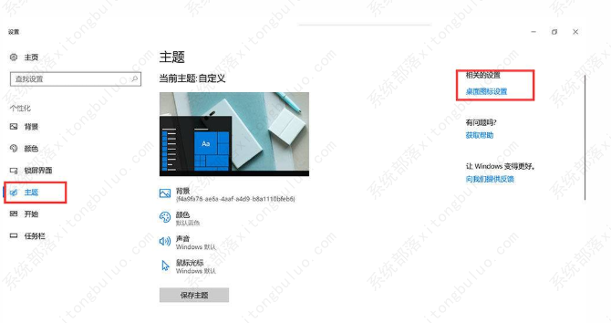 2、在个性化设置界面上,单击左侧的“主题”,然后单击右侧的“桌面图标设置”。