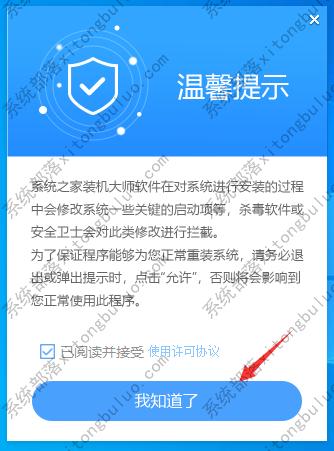 1、首先,关闭所有的杀毒软件,然后运行系统之家装机大师软件,软件会进行提示,仔细阅读后,点击我知道了进入工具。