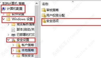 3、然后依次展开“计算机配置-Windows设置-安全设置-本地策略-安全选项”。