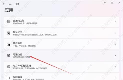 2、在设置面板中,找到“应用”,在其中打开“可选功能”。