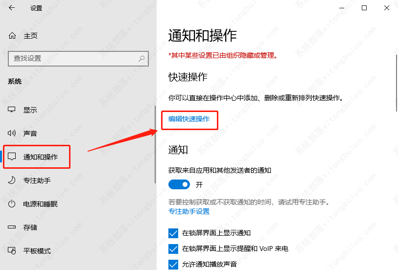 2、在通知和操作中,点击编辑快速操作。