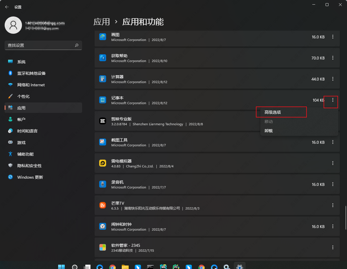 3、来到应用菜单,点击应用和功能的选项,在应用列表中定位到出现无法打开的应用名称,点击右侧后面的三点图标,在菜单中选择高级选项。
