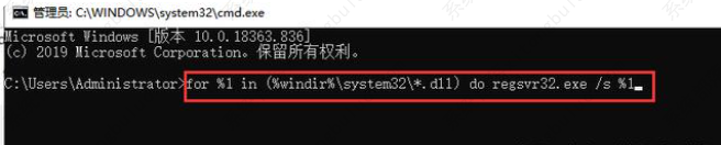 2、输入for %1 in (%windir%system32*.dll) do regsvr32.exe /s %1,回车。如果怕打错可以按“ctrl+c”再“ctrl+v”复制到命令提示符中。