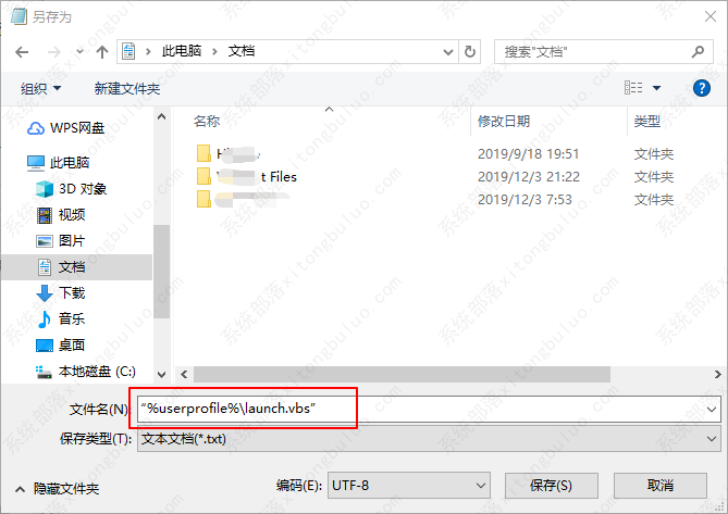 2、将该文件保存在较为保险的位置,如用户文档,毕竟这要作为类似于系统文件的存在,可以按照名称“%userprofile%\launch.vbs”将其保存(带英文双引号,如下图):