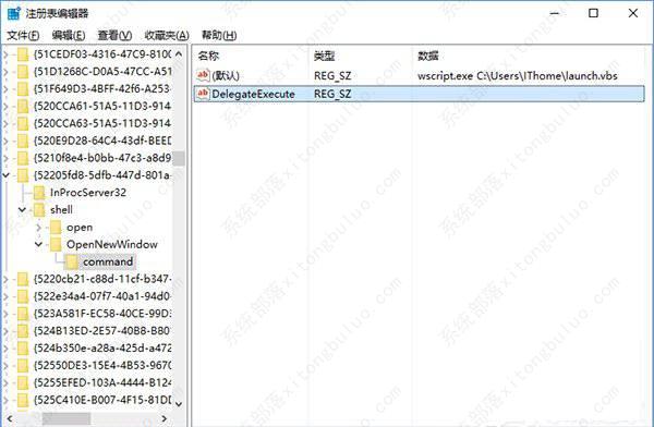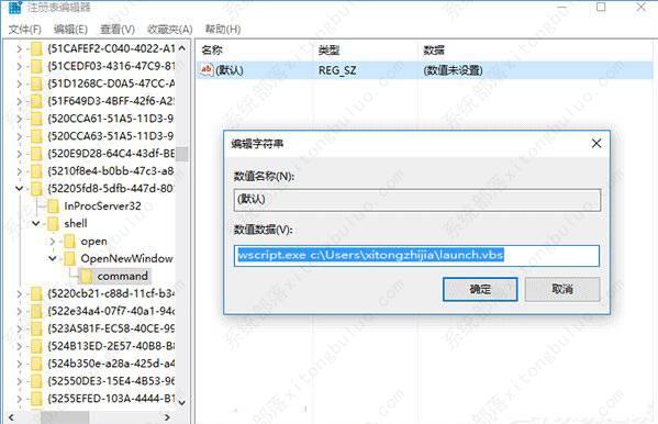 4、设置command默认值,双击右边的“(默认)”,填写如下内容:【wscript.exe c:\Users\你的用户名\launch.vbs】。比如:【wscript.exe c:\Users\xitongzhijia\launch.vbs】
