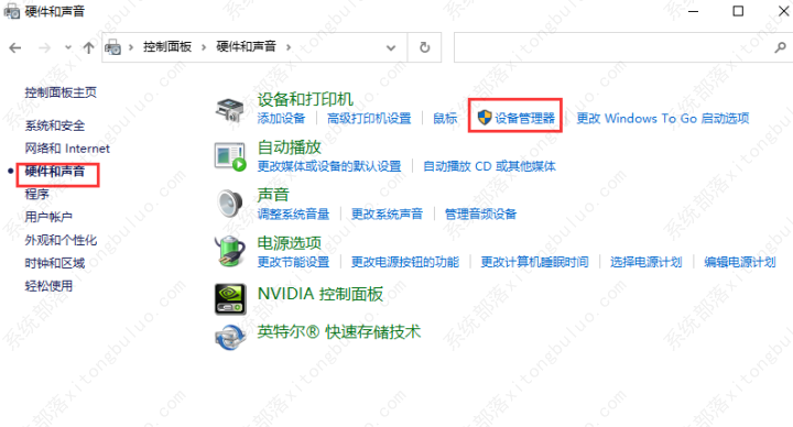 2、点击左侧的硬件和声音,然后在右边找到设备管理器。