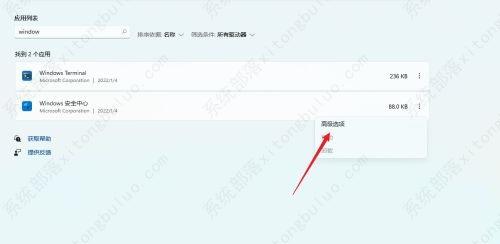 2、找到Windows安全中心,点击右侧的三个点,选择【高级选项】。