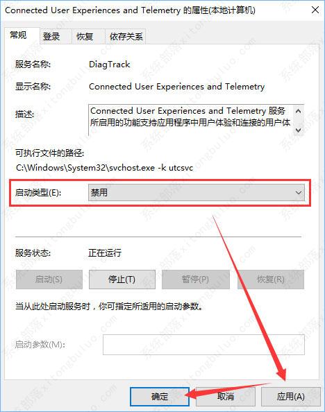 3、在Connected User Experiences and Telemetry的属性窗口,将启动类型改为禁用,然后应用并确定就可以了。