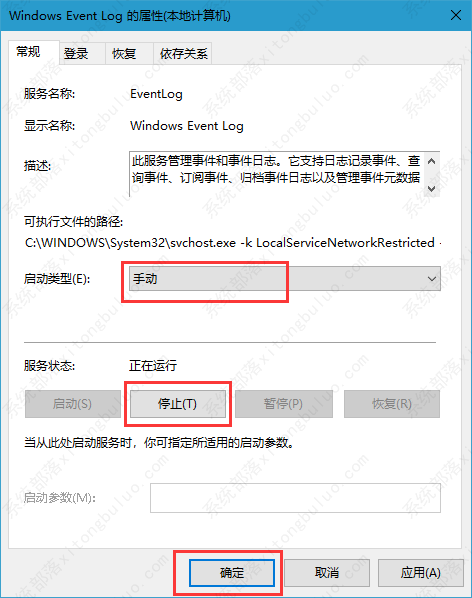 3、双击点击Windows Event Log服务,首先将“启动类型”修改为“手动”,然后点击【停止】,点击应用并确定即可;