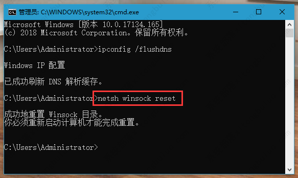 3、刷新dns解析缓存后,继续输入“netsh winsock reset”,回车执行,如图所示: