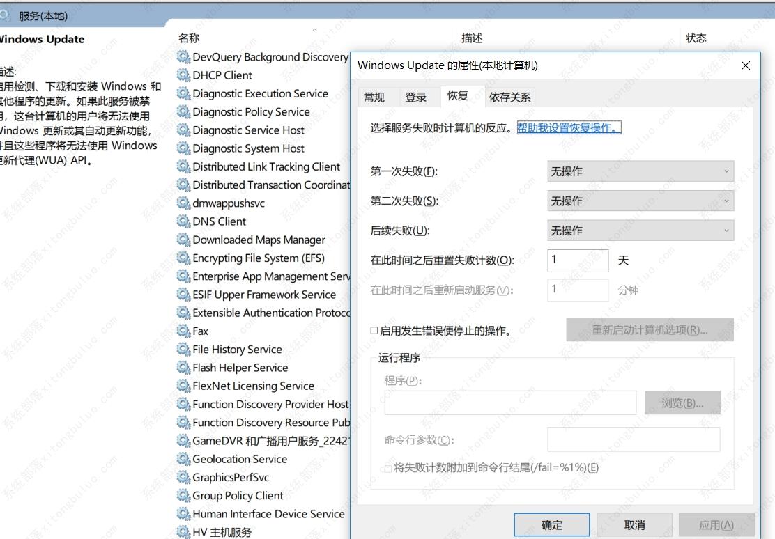1、运行“services.msc”,打开服务,禁止“Windows Update”服务,并在“恢复“选项卡中设置三次失败后“无操作”。