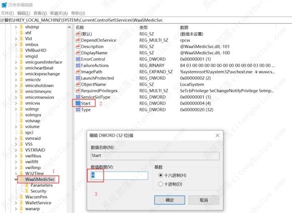 3、运行“regedit”,打开注册表编辑器,定位到 “HKEY_LOCAL_MACHINE\SYSTEM\CurrentControlSet\Services\WaaSMedicSvc”,右侧找到“Start”键,右键点击“修改”,将数值改为“4”。