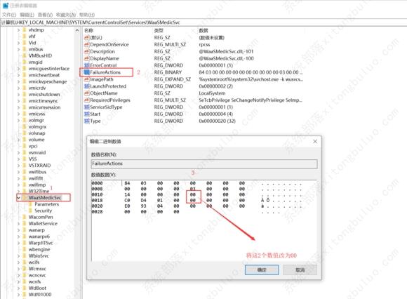 4、再找到“FailureActions”键,右键点击“修改”,修改该键的二进制数据,将“0010”、“0018”行的左起第5个数值由原来的“01”改为“00”,修改完成保存关闭。